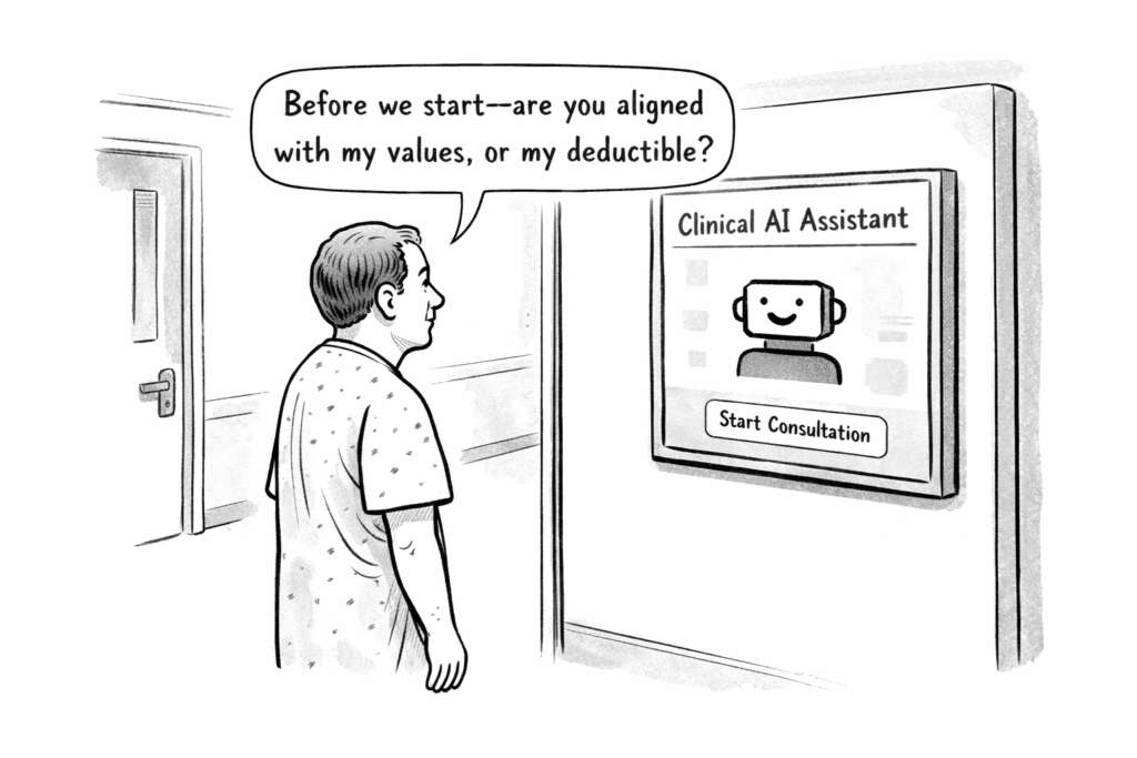Scale that phenomenon up. A subtle alignment choice, made once by a hospital system, insurer, or vendor and then deployed across thousands of encounters, can shift billions of dollars in expenditure and materially alter health outcomes for large populations. These are not “AI company values.” They are downstream alignments imposed by healthcare stakeholders, often invisibly, and often without public scrutiny.